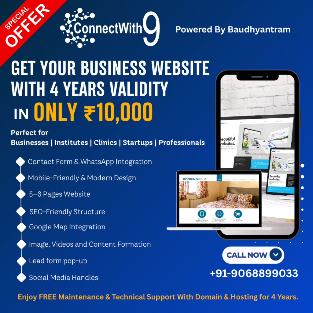 Connect With 9 Powered by BaudhyAntram, our affordable website package is perfect for Businesses, Institutes, Clinics, Startups & Professionals.